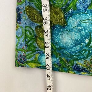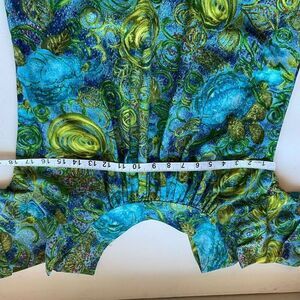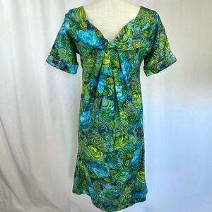 Beautiful vintage 60s Dress, muumuu style, made with vibrant blues & greens, knee-midi length, bow detail at neckline on back, but could also be worn as the front, short sleeves, lovely tropical tiki vibe.