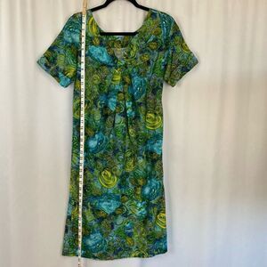 Vintage 60s Muumuu Midi Dress Blue Green Women’s XS-S Retro Tiki Hawaiian Retro