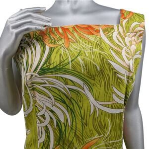 Rare New-With-Tags Hawaiian Tiki Floral Dress by Alice of California vintage 1960's/70's. Large-scale chrysanthemums in white rust & orange with neon pink centers in strappy foliage on a lime green background. 100% cotton panel construction has a high neck, a long back zipper & an awesome detachable train that buttons on the back. It can be used as a wrap if desired!