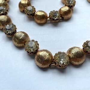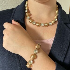 Description: vintage jewelry set from the 1960’s— very large glass crystals and gold texture medallions make up this show stopping set. Can easily dress up any attire, or worn with a blazer/sweater with your favorite jeans