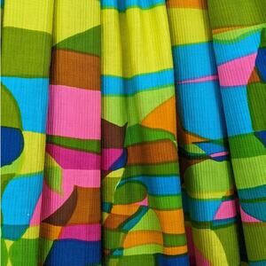 The abstract pop art pattern on this awesome knee-length skirt just screams vintage 1960's in highlighter neon bright hues of greens yellows blues oranges pinks & browns. Woven Screen Print Ultra by APSCO fabric has a vertical ribbed texture & feels like a cotton/synthetic blend. Vintage clothing purists take note: this skirt has been altered - the tiny waistband was replaced with a modern metallic gold wide elastic waistband which stretches nicely. The pull-on skirt has copious gathers which were simply sewn to the waistband with a zig-zag stitch (see up-close pic).