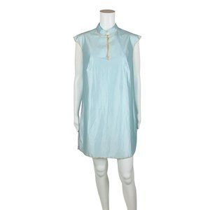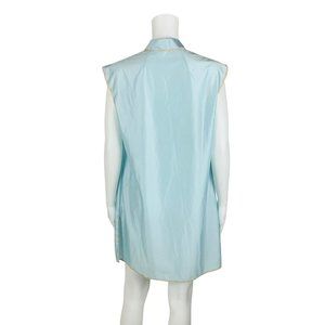 A vintage 1960s nightgown nightie in a baby blue color with a mandarin collar, beige trim detail, a colorful rhinestone closure at the neckline and slits on the side skirt.