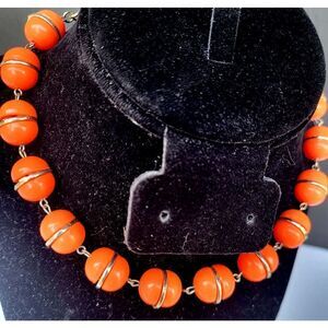 Materials: orange acrylic beads, goldtone metal alloy chain Length: 16" clasp hook in chain Signed noExcellent vintage condition