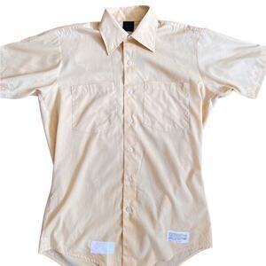 This vintage shirt from the 1960s is a must-have for any fashion enthusiast. The solid yellow color and short sleeves make it perfect for casual occasions. The button-front style and chest size of 42 inches give it a classic look. Made from a comfortable cotton blend material with permanent press sub-style, this shirt is both stylish and practical. The XL size and original Brookfield Uniforms brand make it a great addition to any vintage clothing collection. Look no further than this original, United States-made shirt for a unique and timeless piece.