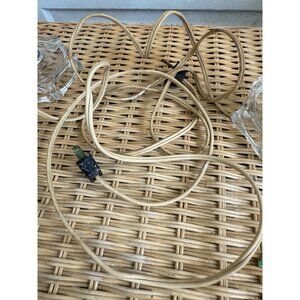 Add a touch of vintage elegance to your space with this pair of 60's table lamps. Featuring purple stacked lucite and clear glass, these lamps are perfect for creating a retro ambiance. These measure 11". The purple is a light lavender and this part is lucite. The bottom clear part is glass. Both lamps are tested and working. The chords are a bit aged and grimey. One plug has some age to the metal prongs but they work fine. Some of the lucite pieces have a little notch I thought was a chip but several of them have it and looks to be where the hole was drilled on them. It is not noticeable when displayed. Overall in good vintage condition.