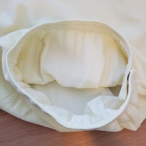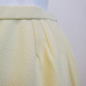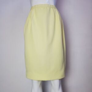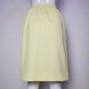 Vintage 60s pastel yellow knee-length pencil skirt. High-waisted with hook/zipper closure on side and inner lining. No pockets.
