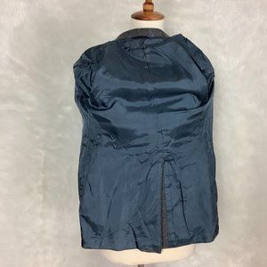 This is a vintage 1960s, long sleeve, peal collar, double breasted, gray with red and blue pinstripe sport coat blazer jacket from Roos Atkins. Has two flap pockets. No flaws. No size label. No materials tags, feels like wool. Size based on measurements. Mannequin specs: Size 6-8, 34 in 26 in 35 in. retro, academia.