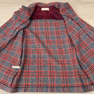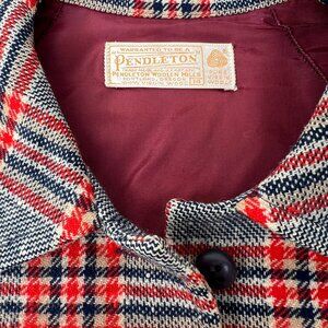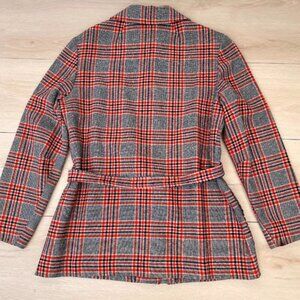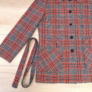 Vintage 1960s Pendleton Lightweight Wool Shacket-style Grey Red Navy & Cream Tartan Plaid 49er Jacket with detachable matching belt in vintage size 14 (fits like a modern 10). No holes, snags, major marks or stains; there's a small coffee stain on the lining of the underside of the lapel (shown in pictures) barely visible from the outside.