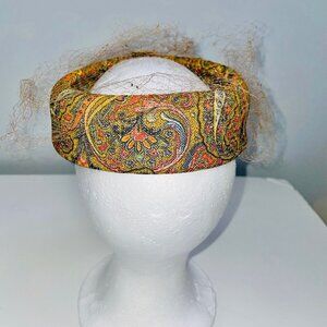 Vintage 60s Pillbox Hat Orange Paisley Net Church Wedding Costume Theatre