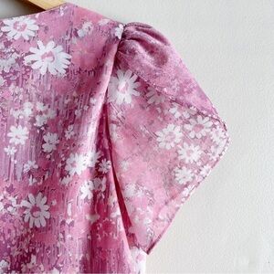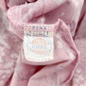 Vintage 1960’s Blouson Midi Dress by Lady Carol Petites of New York, featuring a round neckline, semi-sheer bodice overlay with side tie and shoulder buttons, shoulder gathered split short sleeves, elasticized waist, flowy semi-sheer full swing skirt, midi length. Color: pink floral print.