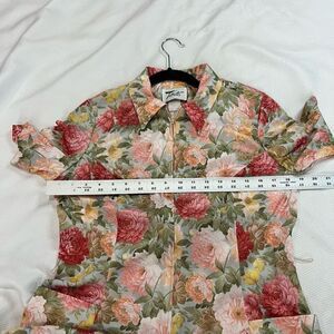 Vintage Pink Peonies Floral Zip Up Dress. Vintage size 14 more like a current medium with measurements in the pictures. No stains but has a couple of small holes shown in the picture.