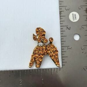 A spectacular and highly collectible vintage figural poodle brooch from the 1960s. While unsigned, this piece exhibits all the hallmarks of a high-end designer, including its quality construction and brilliant stones. The adorable poodle design features a body of densely clustered, high-domed topaz brown rhinestones that create incredible dimension and sparkle. The head, legs, and tail are rendered in a textured gold-tone metal. This is a well-documented design, making it a quintessential example of high-quality mid-century costume jewelry, perfect for any collector or poodle lover!