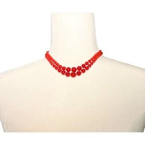 Vintage 60s Red Double Strand Glass Beaded Choker & Clip Earrings Set