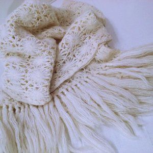 Vintage 60s Shawl Wrap Scarf 63x17 Loose Knit Textured Floral Fringe Glam Cream