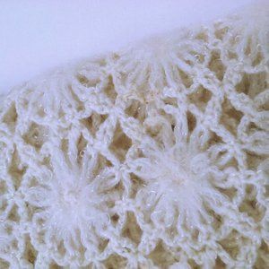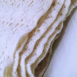 -- Unbranded Unmarked made in USA, see-through loose knit textured flowers pattern with fringe, easy care hand wash, super-soft unknown material acrylic? yarn blend? in shimmery natural Cream Beige colorway with glam sparkle fleck.