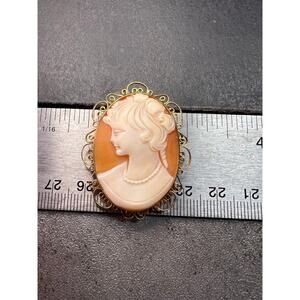 Vintage 1960s–1970s hand-carved shell cameo in a 12K gold filled filigree setting. Features a left-facing lady in profile with detailed carving and natural shell color variations in peach and ivory tones.