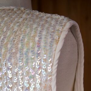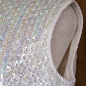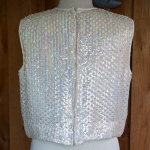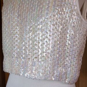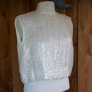 Cropped to be sure, but would pair well with a high waist pant or skirt. Festive to be sure! Rainbow iridescent sequins, almost like a woven net