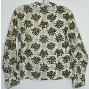 Authentic vintage “Shirtmaker” blouse from the late 1960s–early 1970s, made in the USA from crisp 100% cotton. Features a charming Peter Pan collar, full button front, and a whimsical floral print in teal, olive, and amber tones on a cream background, with subtle toile-style imagery behind the bouquets. Classic tailored fit with button cuffs and a structured silhouette. Tag reads “12-32.” Perfect for cottagecore, vintage workwear, or a retro everyday look.