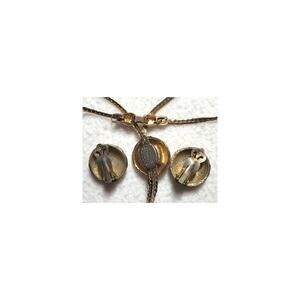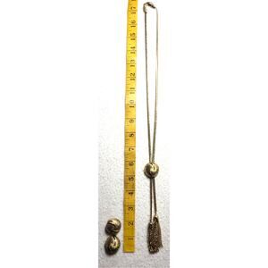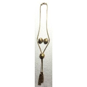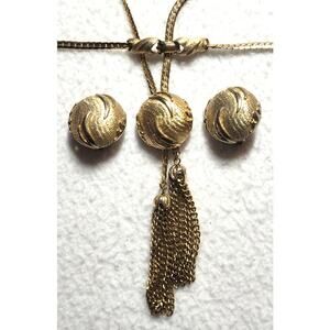 Vintage 60s Signed Goldtone Slider Lariat Necklace Clip On Button Earrings Set