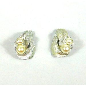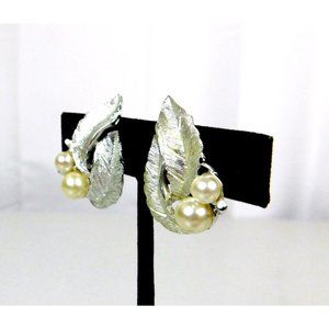 Vintage 60s Signed Sarah Coventry Textured Leaves Faux Pearls Clip on Earrings