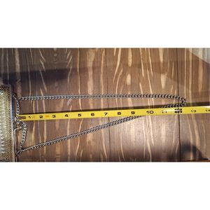 This bag has a silver fastening at the top of the bag with a hand held double chain.