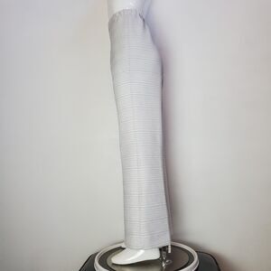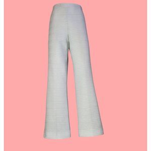 Vintage late 60s/early 70s light gray striped flared leg trousers with silver threading. High-waisted with elastic waistband. No lining or pockets.
