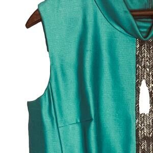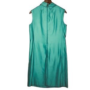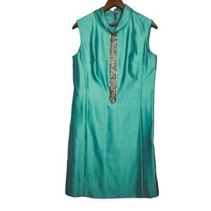 Vintage 60s Size Medium Mod Aqua Shantung Dress Jacket Suit Set Silver Beading