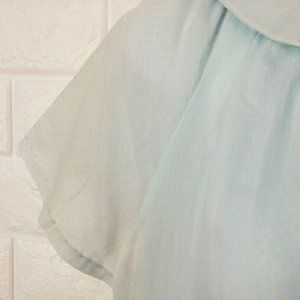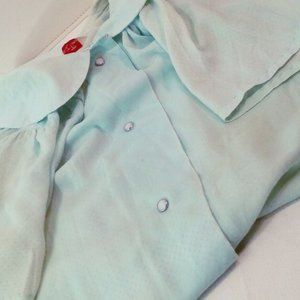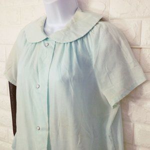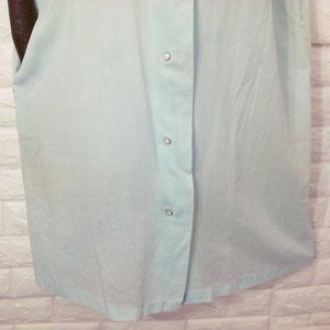 -- Smart Time style 3532 Garment Union Tag made in USA, Ladies - L(12), Semi-Sheer mini polka dot, a-line gathered yoke bodice, peter pan collar, pearl snaps closure, short sleeves, easy care wash polyester rayon blend fabric, muted neutral pastel blue colorway.