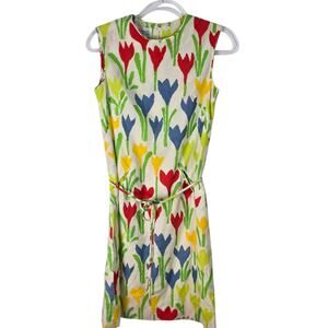 Rare vintage 1960s Tanner of North Carolina mini shift dress featuring bold multicolor tulip print in red, yellow, blue, and green on a white background. This classic sleeveless silhouette has a straight shift cut, hidden side pockets, and comes with a matching fabric belt to cinch the waist if desired. Crafted in a lightweight woven fabric, it zips at the back for easy wear. A vibrant mod piece with timeless mid-century charm—perfect for collectors, retro enthusiasts, or statement vintage style. A true 60s gem that channels bright, cheerful flower power fashion.