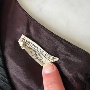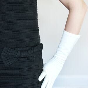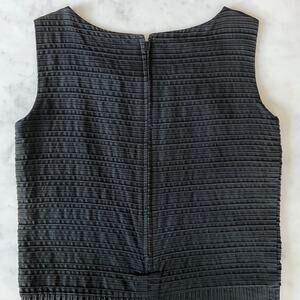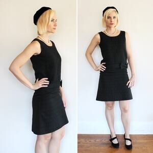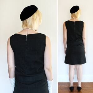 Vintage 60s black sleeveless shift dress with an adorable big bow detail at the waist. Made of a nice line-textured material. Darted bust, scoop neck and drop waist. The dress looks like a 2-piece top and skirt-- the top lifts to show the acetate lining (only the top part is lined). Metal zipper closure runs down back. A classic, cute black dress! In very good vintage condition with some slight fading to the backside of the interior lining, which can't be seen when worn. The dress was professionally dry cleaned.