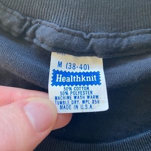 this vintage shirt fits smaller than labeled. labeled a size medium, fit's like a small. see photos for measurements. model is 5'10" 156 lbs for reference. HealthKnit tee. single stitch. made in usa. cotton blend. thin soft material. faded. distressed. has wear on Ringo's face. has a small rip / hole on front of the shirt. With The Beatles John Lennon Paul McCartney George Harrison Ringo Starr