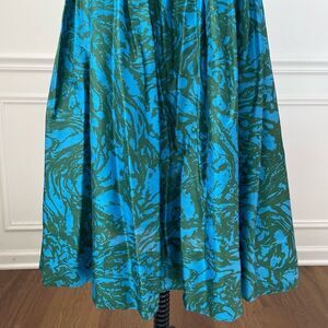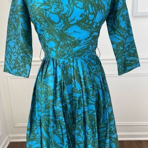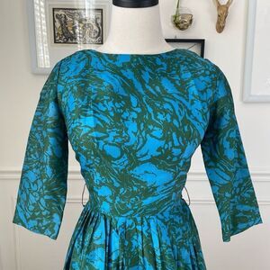 Vintage 60s hostess fit and flare dress. Turquoise and green three-quarter length sleeve and scoop back. No tags in this dress other than a lot number tag on the inside back zip closure with a metal Elem zipper. There is no fabric content tag, but I would not be surprised if this is silk. Lay flat measures 40 inches shoulder to him, 17 inches armpit to armpit and 13 inches straight across the waist. There are a couple of stitches on the underside of one of the arm seams. See pics. Based on the measurements above, I estimate this to be roughly a modern size 4, but please double check to ensure the proper fit for you. It is featured on a size medium dress form and although it fits, it is snug.