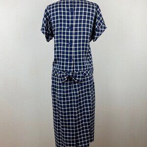 Vintage 60s Two-Piece Dress Straight Skirt Drop Waist Top Medium Blue Check Bow