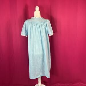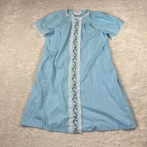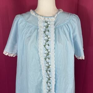 Pale blue and Swiss dot pattern, with lace and floral embroidery pattern. Snap up nightgown robe with short sleeves, single side pocket and no stretch.