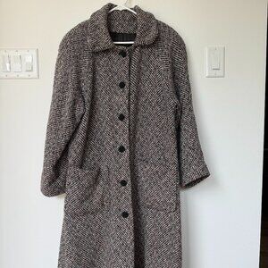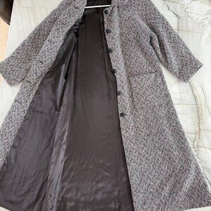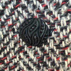 The Vintage 60s Women's Full-Length Wool Swing Coat in black and white herringbone with a red accent is a classic and stylish piece from the early-to-mid 1960s. Outer Fabric is wool/heavy tweed in a black and white herringbone pattern with fine red accent yarns, making it a classic winter coat textile. Lining is smooth, satiny, and black. There is slight shoulder padding, but not extremely structured. This original coat features a full-length swing style overcoat, with a shoulder to shoulder measurement of 18 inches and a shoulder to hem length of 49 inches. The regular size roughly modern L/XL (Vintage size 16-18) with a chest size of 46 inches makes it a versatile and fashionable choice for seasonal occasions. 6-button coat, with large black buttons with molded/raised swirled motif and faceted beads - inspired by late-Victorian/Edwardian passementerie and jet buttons - recreated in molded plastic/resin. A-line cut designed to wear over a dress/suit, typical "swing" or "car coat". No visible brand/tags. Two large front patch pockets. Fully lined. Warm and stylish for winter with a timeless mid-century look. In very good vintage condition for its age! Message me if you have any more questions! :)