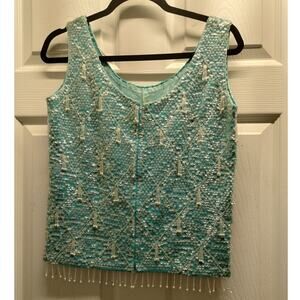 Vintage 60s Womens Size Small Blue Sequin Beaded Sleeveless Wool Theater Dance Costume Tank Blouse Top