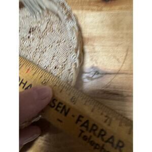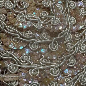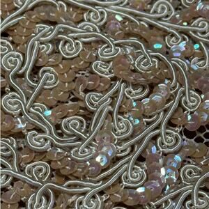 color of the flat pailettes is a taupe pink, hat also embellished with narrow, elastic cording shaped into curlicues, the diameter is about 5.25"