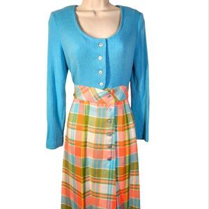 Bright Pastel Plaid Wool Wrap Skirt Button Down Blue Green Orange Peach Turquoise Top is a Ribbed Long Sleeve Button Down Turquoise Blue Sweater Empire Waist Babydoll Style