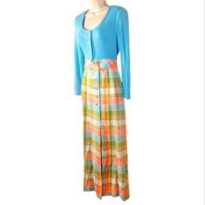 Sue Brett 1960s Vintage Wool Sweater Dress Long Sleeve Maxi Mid Century Modern Empire Waist Wrap Tartan Button Skirt Blue Orange Green M