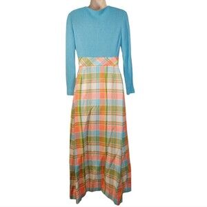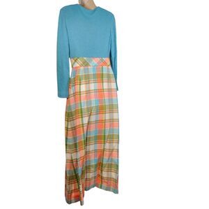 Vintage 60s Wool Dress Long Sleeve Maxi Wrap Tartan Button Blue Orange Green M