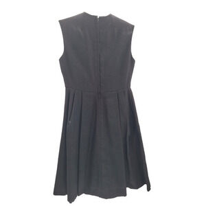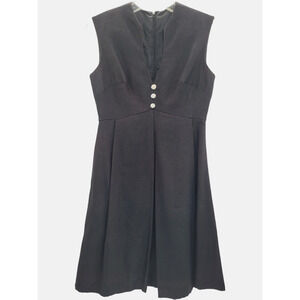 Vintage 60s Iridescent Black Wool Rhinestone Button Sleeveless V-Neck Empire Waist Pleated Skirt Party Dress