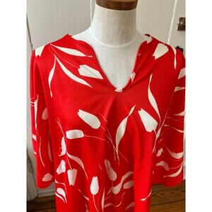 Vintage floral print 60s kaftan tunic coverup. Good preowned condition with a few spots and a couple of pulls noted - no size but approximately a S/M. This versatile piece could be worn as a beach cover up, a tunic or a mini dress. Total 60s vibe with batwing dolman sleeves, a bright red orange background with white tulip print