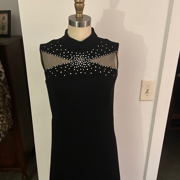Fabulous black knit dress , cocktail length, with rhinestones and black net inserts