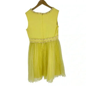 Awesome mod party dress with pleated chiffon bottom and acetate lining. 34” bust, 33” length, 28” waist. Great vintage condition with no holes or heavy wear, a little dingy in the armpits.