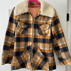 Vintage union made plaid jacket with faux sherpa collar. Such a cutie and perfect for fall! Last 2 photos show how much these are going for online. I got mine from a vintage store in Ventura CA, only selling because I don’t get enough use out of it. Colors are yellow, blue tan and white. The interior is in fair condition with some spotting and hand stitching but not noticeable when wearing. I just had it dry cleaned! Has pockets and gold buttons. Very similar to Sezane! Estimated XS-S, measures 19” pit to pit 25” length. #fallplaid #60s #cozy