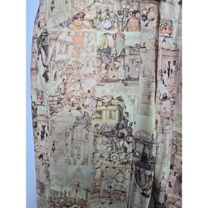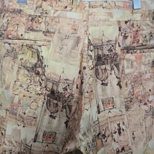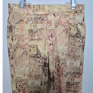Circa late 1960s/early 1970s Izod of London trousers featuring an allover illustrated city/market-scene print , Carriage , Wrestlers ( Old timey). Straight-leg polyester- has stretch