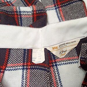 -- JC Penney Fashions made in USA , women's 32x31 marked (14), logo labels, flat front hi-rise high-waisted, cuffed wide flare leg, two front pockets, buttons metal zipper closure, bold plaid pattern, woven material, dry clean/handwash /washable 100% acrylic in brown orange cream colorway.