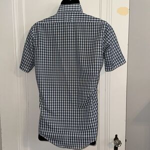 Vintage late 60s/early 70s J.F. Austin Shirtmakers blue & white check polyester/nylon short sleeve shirt