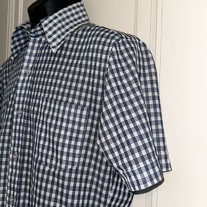 Vintage late 60s/early 70s J.F. Austin Shirtmakers blue & white check polyester/nylon short sleeve shirt
