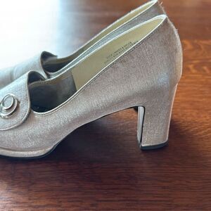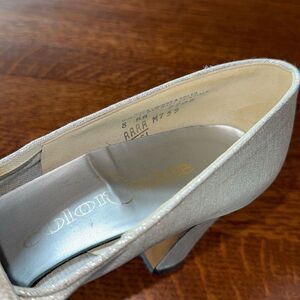 1960s silver metallic heels, with silver detail on the front. They are a size 8 and feature a man-made material with sock linings and soles. The heels have a block heel and are suitable for cocktail occasions and mid-century modern style.